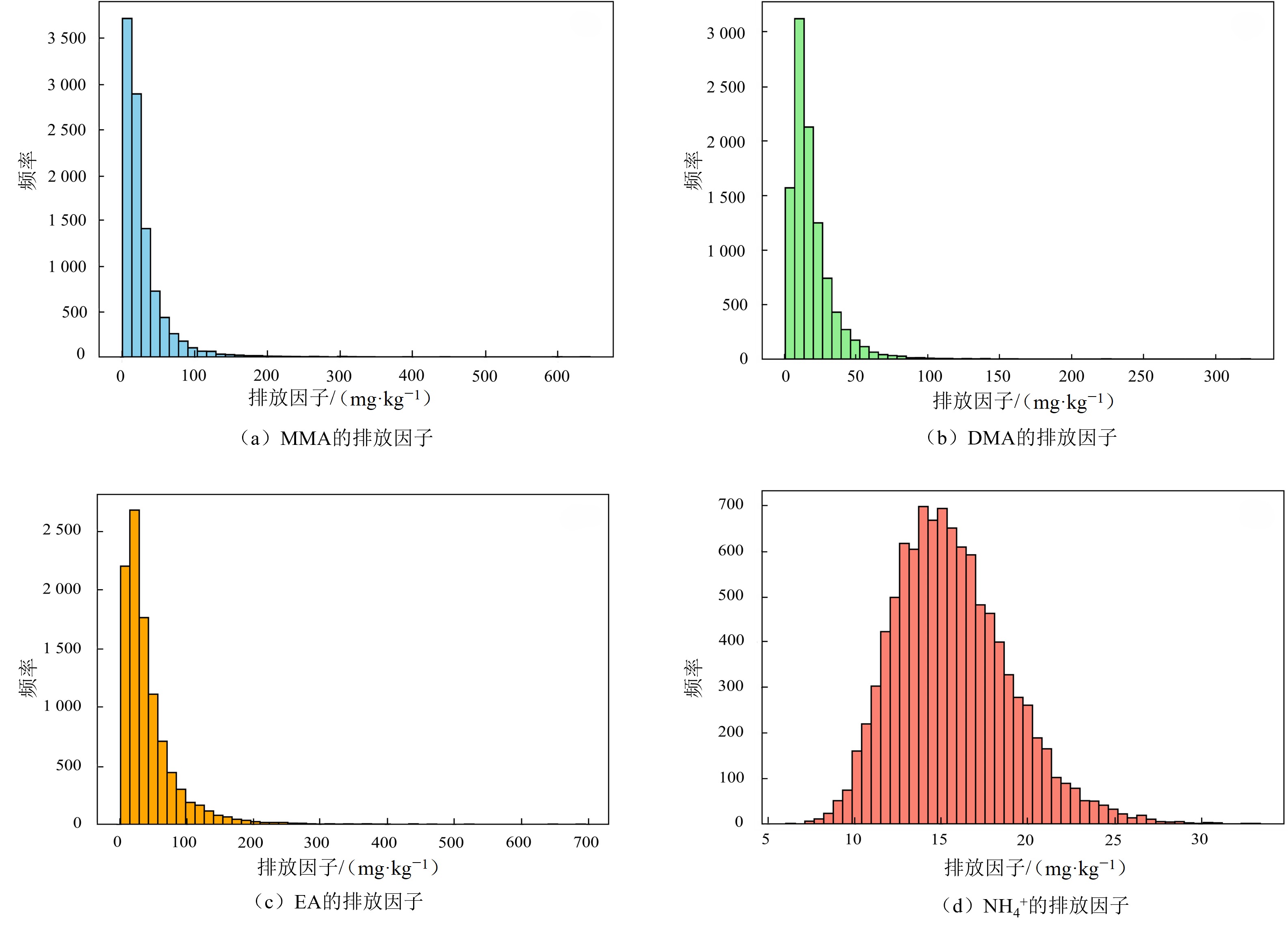 图1 燃煤燃烧后经对数正态变换的MMA、DMA、EA、NH4+排放因子分布(Monte Carlo进行10000次模拟)